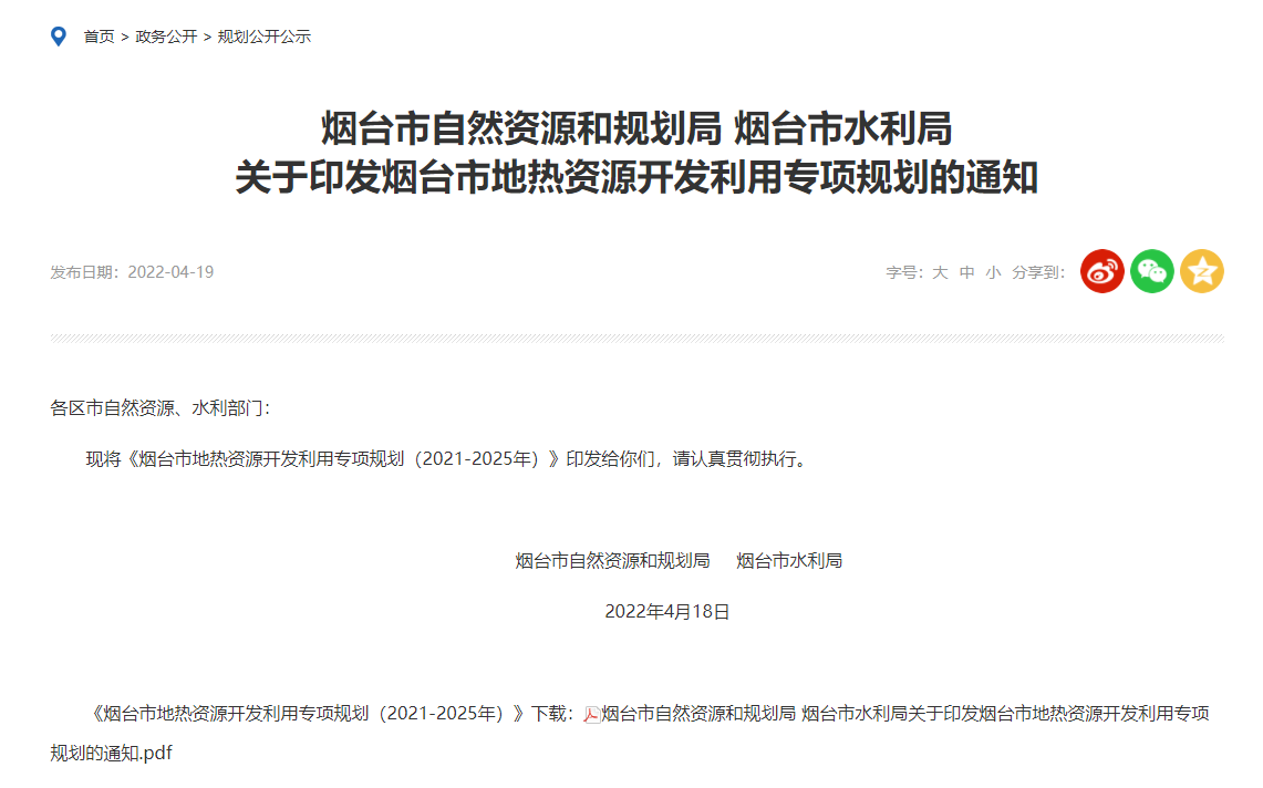 地大熱能地熱+多能互補新聞網(wǎng)訊:近日,煙臺市自然資源和規(guī)劃局、煙臺市水利局聯(lián)合印發(fā)了《煙臺市地熱資源開發(fā)利用專項規(guī)劃(2021-2025年)》(以下簡稱《規(guī)劃》)。