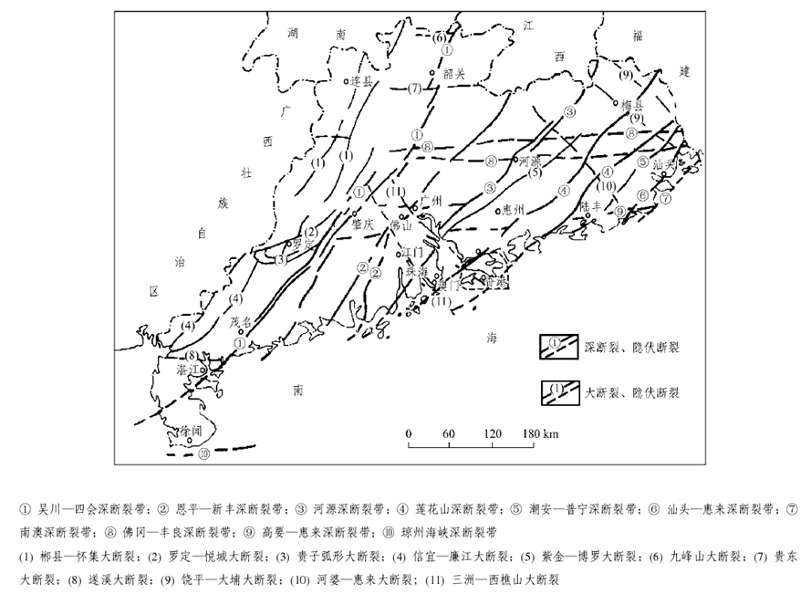 廣東省在大地構(gòu)造上屬華南褶皺系的一部分,其演化過程經(jīng)歷了三個發(fā)展階段及相應(yīng)的構(gòu)造旋回和構(gòu)造運(yùn)動:加里東運(yùn)動形成緊密線型褶皺,主要呈NEE方向,成為廣東省構(gòu)造骨架的基礎(chǔ);印支運(yùn)動形成多方向的過渡型蓋層褶皺;燕山運(yùn)動以斷塊造山、NE向和EW向深大斷裂控制的火山噴發(fā)、巖漿侵入為主。深大斷裂對廣東省的沉積建造、巖漿活動、變質(zhì)作用和成礦作用有較明顯的控制。主要的深斷裂有吳川-四會、恩平-新豐、河源、蓮花山、潮安-普寧、汕頭-惠來、南澳、佛岡-豐良、高要-惠來、瓊州海峽等,主要的大斷裂有郴縣-懷集、羅定-悅城、貴子、信宜-廉江、紫金-博羅、九峰山、貴東、遂溪、饒平-大埔、河婆-惠來、三洲-西樵山等。這些深大斷裂都具有規(guī)模大、活動時間長等特點。從總體上看。廣東省境內(nèi)大型褶皺和深大斷裂以NE向為主,間夾EW向和NW向構(gòu)造組成復(fù)雜的構(gòu)造圖景。