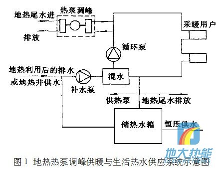 以往計(jì)算分析說(shuō)明[:地?zé)?a href="http://www.moonheart.com.cn/t/熱泵供暖.html" >熱泵供暖系統(tǒng),以地?zé)峒?a href="http://www.moonheart.com.cn/t/熱泵.html" >熱泵調(diào)峰供暖方式的供暖成本和投 圖1地?zé)?a href="http://www.moonheart.com.cn/t/熱泵.html" >熱泵調(diào)峰供暖與生活熱水供應(yīng)系統(tǒng)示意圖資低于熱泵單獨(dú)作熱源的供暖方式。