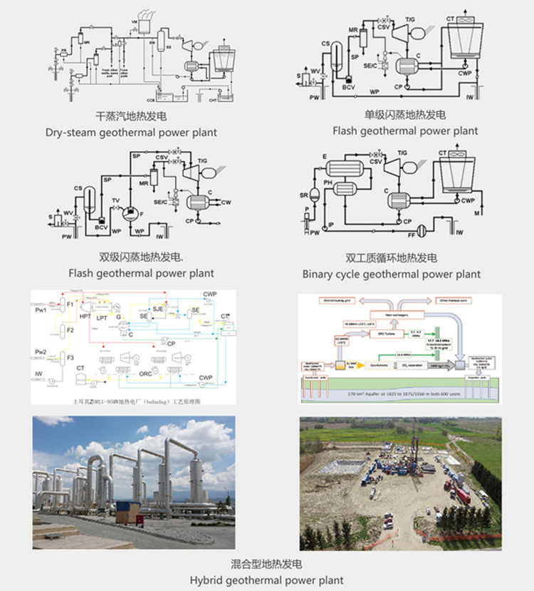 地熱發(fā)電需根據(jù)地熱流體的溫度、壓力以及它們的水、汽品質(zhì)的不同而采取不同的設(shè)計方案。其主要類型包括:干蒸汽地熱發(fā)電、單級閃蒸地熱發(fā)電、雙級閃蒸地熱發(fā)電、一井一站地熱發(fā)電、混合型地熱發(fā)電、雙工質(zhì)循環(huán)地熱發(fā)電、干熱巖發(fā)電。