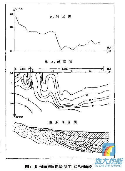 圖1 Ⅱ剖面地質物探(縱向)綜合剖面圖 物探電測深成果和鉆井資料表明,本區(qū)第三系中有三個含水段,分別在距地表50~70m、100~140m、170~200m處,每段有1~4個含水層,單層厚度2~26m。富水程度較好,在11眼成井中,單井單位涌水量最大可達60t/h。