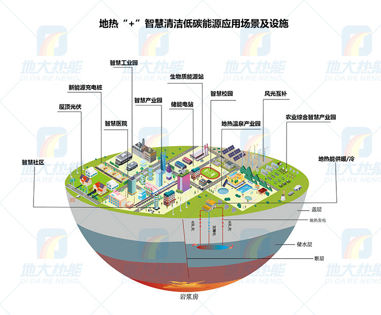地熱+(風能、太陽能、氫能、儲能、水能、生物質(zhì)能等)新能源,根據(jù)因地制宜、多能互補實現(xiàn)能源綜合開發(fā)利用。